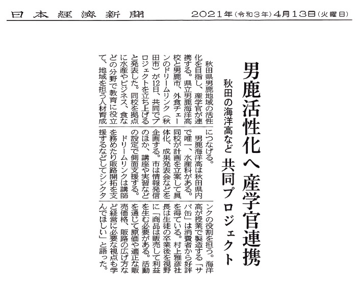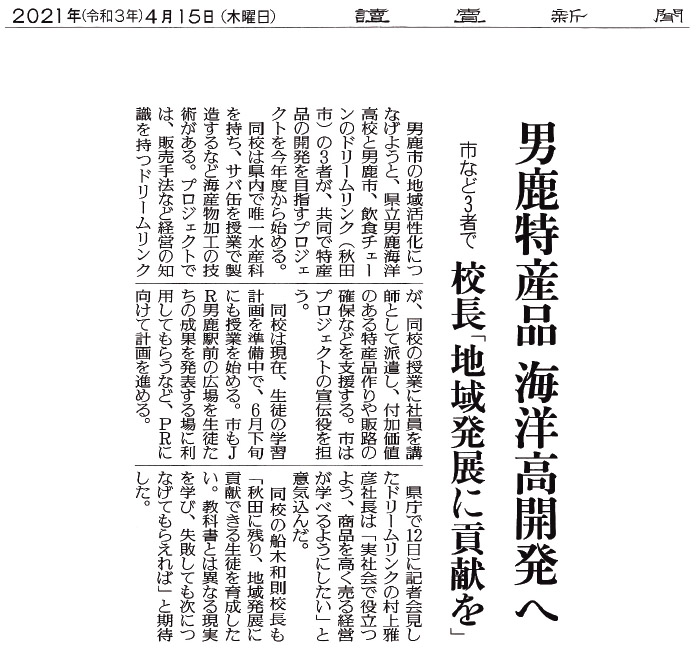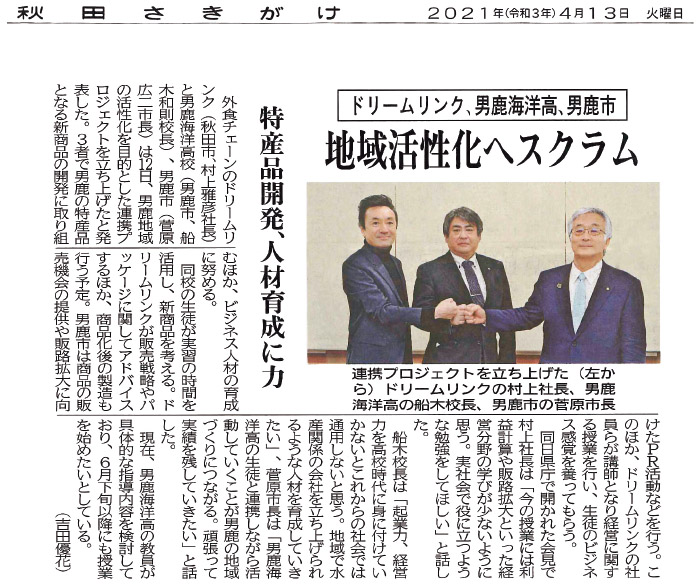 2021年4月12日に発表いたしました「男鹿海洋高等学校」「男鹿市」「ドリームリンク」による産学官の取り組みについて、その経緯などを記します。