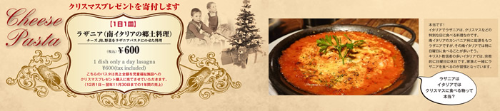店舗でご提供しております1日1皿限定のパスタ「ラザニア(南イタリアの郷土料理)」チーズ、肉、野菜をラザニアパスタにのせた料理です。このパスタの売上金額を児童福祉施設へのクリスマスプレゼント購入にあてさせていただきます。(12月1日~翌年11月30日までの1年間の売上)