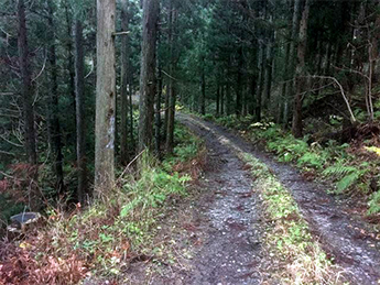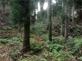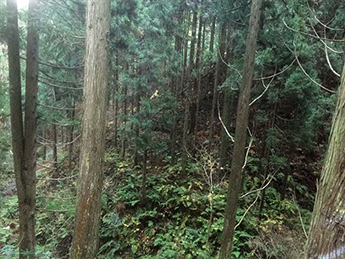 秋田県由利本荘市から横手市方面へ向かう本荘街道(国道107号線)は豊かな自然に恵まれ、子吉川水系である石沢川が街道に沿って流れています。当社の山、「秋田実宝富士(あきたじっぽうふじ)」はその街道沿いにある山内の南に位置した奥名免沢(おくなめざわ)にあり、立ち並ぶ秋田杉が存在感を示しています。秋田実宝富士は春から初夏にかけてワラビやゼンマイなどが豊富に採れ山菜の宝庫となります。山菜が宝のように実ることから秋田実宝富士と名付けられました。