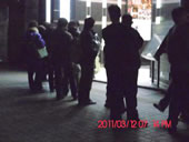 震災当日は停電になりました。電話もつながらず多くの情報源が断たれました。まさか、この様な大震災の始まりだという意識はまだありませんでした。そんな中、首都圏では交通網が麻痺し、帰宅難民の方々が駅前に溢れているという情報が入ってきました。当社の首都圏の店舗は駅前や繁華街にあります。最初にできた行動は、帰宅難民の方々をお店にご案内することでした。「帰宅手段のない方々は当店でお休みください。お店を無料で開放しております」という様な貼紙を各々の店で作成して店頭へ貼り、手が空いているスタッフは店頭で告知を行いました。多くの方々がご飯を召し上がっておりませんでしたので、豚汁などを各店の判断で無料でお配りすることが出来ました。