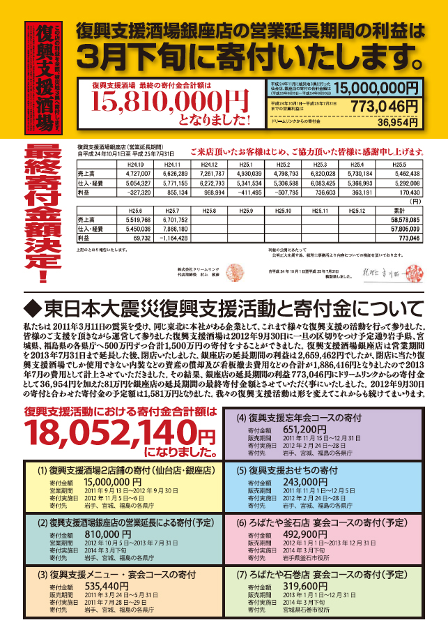 復興支援酒場「銀座店延長分の寄付」について(2014.02.19)