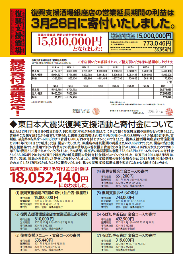 復興支援酒場銀座店の営業延長期間の利益は3月28日に寄付いたしました。(2014.03.28)